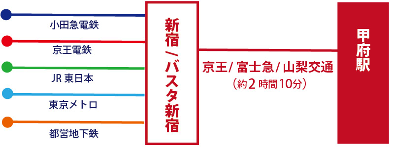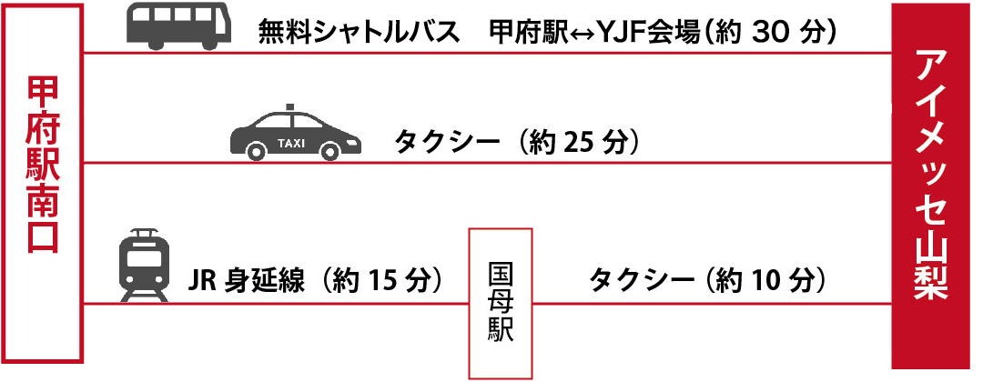 新幹線・電車の場合 バスでお越しの場合 車でお越しの場合 会場直通シャトルバス 甲府駅からの無料循環バス アクセスマップ アイメッセ山梨 所在地:〒400-0055 山梨県甲府市大津町2192-8TEL:055-243-1811055-243-1811 公式サイトはこちら Googlemapで見る ACCESS ~交通機関別の行き方~ 東京→甲府 甲府駅→会場 東京→甲府 新幹線・電車の場合 バスの場合 車の場合※アイメッセ山梨専用駐車場は約1000台完備(無料) 10日の会場初日は混雑が予想されます。駐車場入り口で係員がご案内します。 参考ルートはこちら(外部リンク) 会場直通シャトルバス 遠距離シャトルバスの申込は2月中旬に受付開始予定です 遠距離シャトルバス 飛行機の場合 東京発の甲府方面への飛行機はございません 甲府駅→会場 甲府駅からYJF 会場まで無料循環バスをご用意いたします。時刻表及び乗車場の詳細はこちらをご覧ください。 無料シャトルバス時刻表及び乗車場所案内